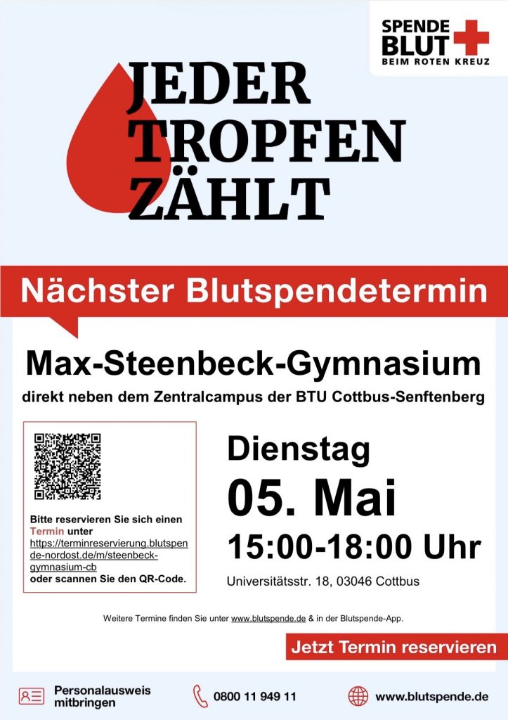 Am Dienstag, den 5. Mai, findet am Max-Steenbeck-Gymnasium wieder ein Blutspendetermin des DRK statt. In der Zeit von 15:00 bis 18:00 Uhr können Erwachsene mit einer Blutspende einen wichtigen Beitrag leisten.
