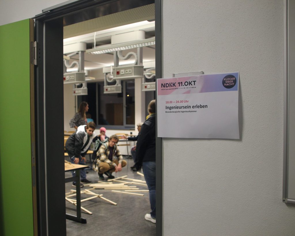 So präsentierte sich die Brandenburgische Ingenieurkammer auf besonders kreative Weise. In ihrem Raum konnten große und kleine Tüftler auf einer „Baufläche“ selbst aktiv werden: Mit Holzstäben ließen sich stabile Brücken konstruieren – ein spannender Einblick in die Welt des statischen Bauens.