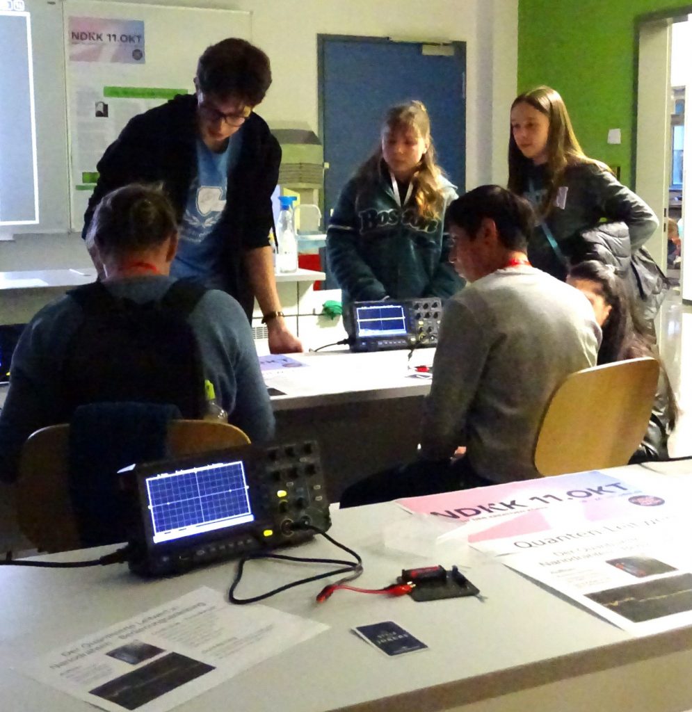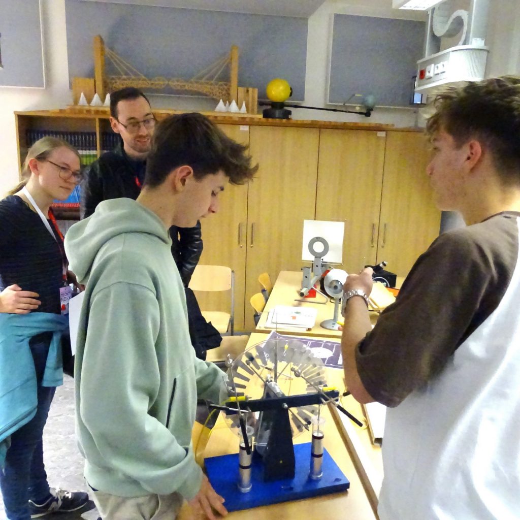 Im Themenbereich der Modernen Physik ging es dann richtig wissenschaftlich zu. Hier konnten Besucherinnen und Besucher verschiedene physikalische Phänomene selbst erforschen – etwa bei einem kleinen Experiment zum Elektrolyseur. Ein besonderes Highlight war der Themenbereich „100 Jahre Quantenphysik“. An mehreren Messstationen – darunter ein Michelson-Interferometer zur Wellenlängenmessung – wurden faszinierende Quantenphänomene wie die Unvereinbarkeit von Weginformation und Interferenz anschaulich demonstriert.